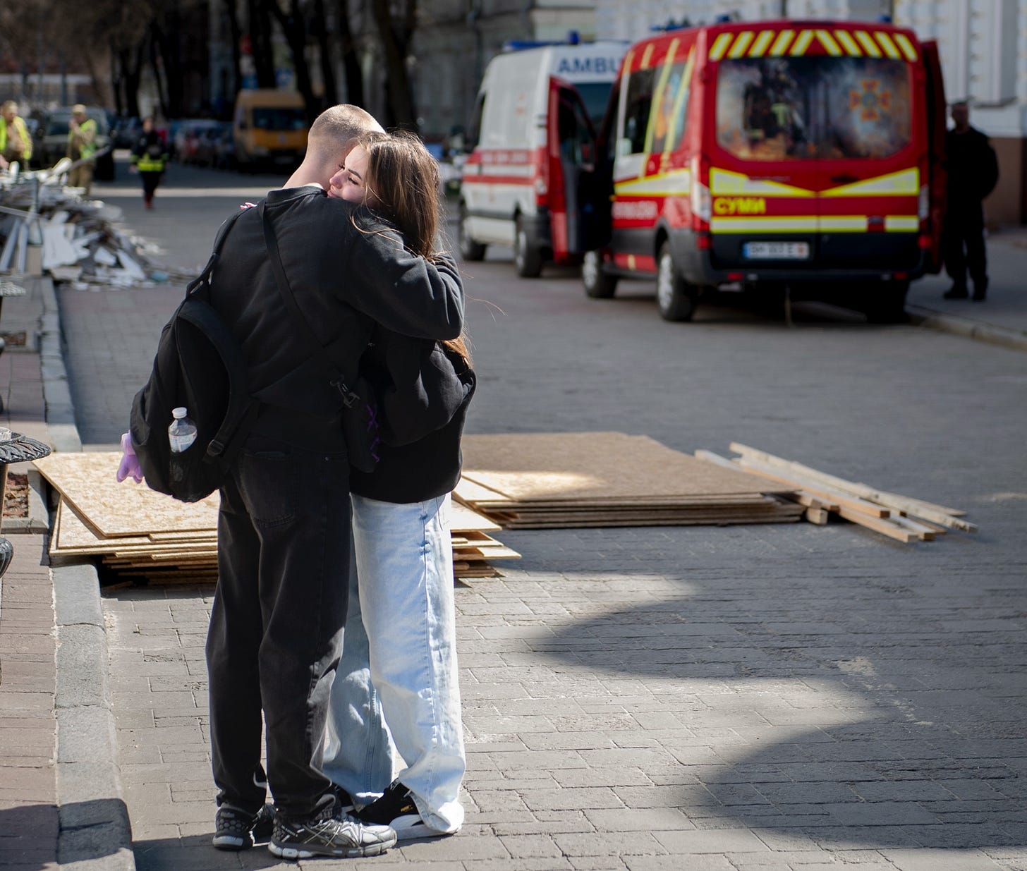 Teenagers embrace after paying tribute to the thirty-five people massacred in Sumy City. Paul Conroy
