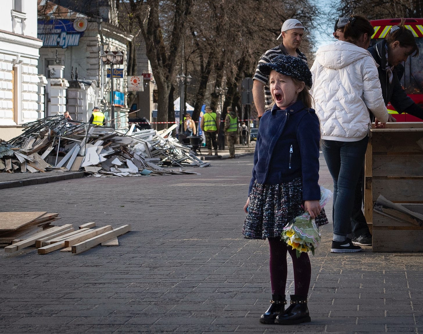 The young girl, dressed in her Sunday best and clutching a small bouquet, was too shy or frightened to lay them alongside the growing pile of tributes to the thirty-five victims of Sunday's missile attack on Sumy. Resisting all attempts by her grief-stricken mother to step forward, she silently absorbed the scene as first responders and an army of workmen went about the grim business of clearing the aftermath.
